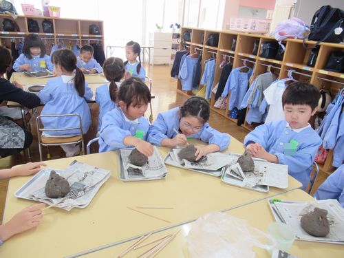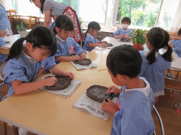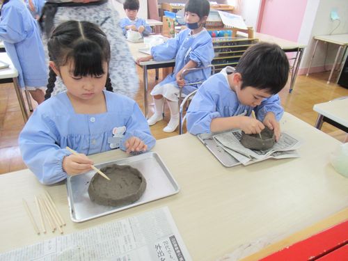 形を作って、もようをつけて。思い思いの作品ができていきました。乾かしたら下焼きに出します。