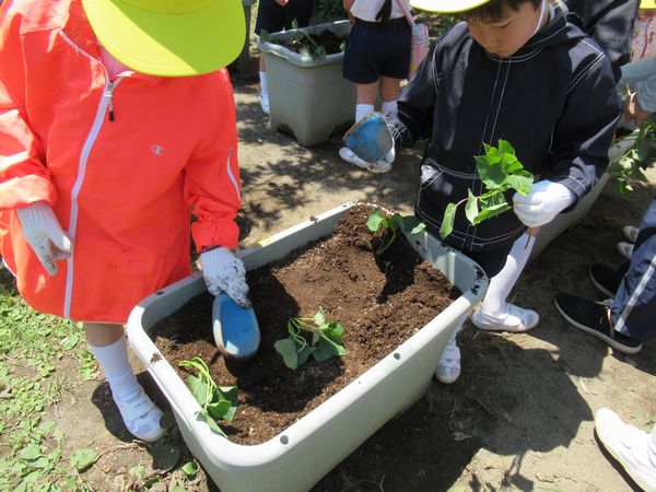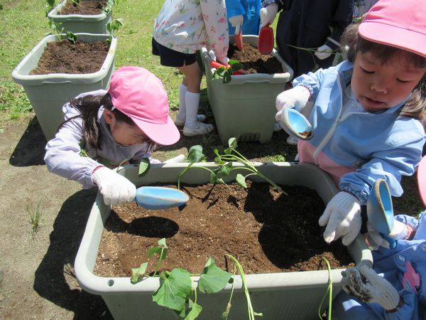 ぞうさんがさつまいもの苗を植えました。今年の収穫はどうなるでしょう。