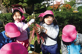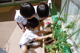 緑に囲まれた園庭で、野菜や植物を育て自然に触れながら「生命」を感じとっています